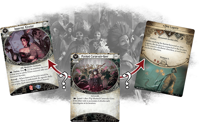 在《恐怖狂欢节》的游戏中,会加入数张名为【佩戴面具的狂欢节行人】的双面牌,每一张双面牌都需要调查员花费线索才能揭露其背后的真实身份: