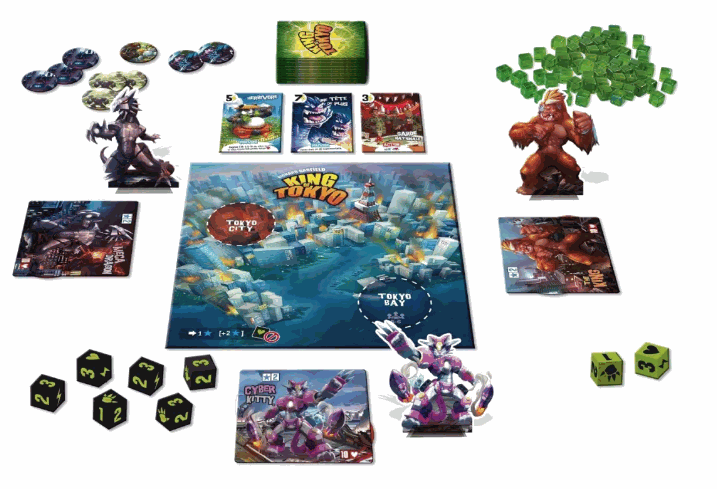 这是一款规则简单,但极富游戏魅力的对抗游戏,游戏仅靠特殊的骰子就可以进行,玩家将扮演入侵东京的庞然大物为东京展开争夺之战,这就是《东京之王》所呈现给我们的特殊世界。