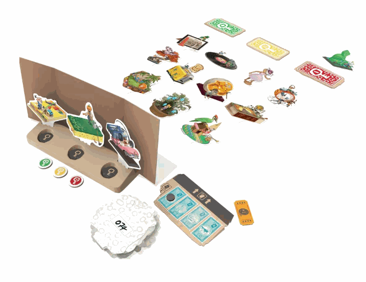 游戏配件为3张线索区域板块、9个线索标记、1个加成标记、1个屏风和底座和最重要的84张卡牌。