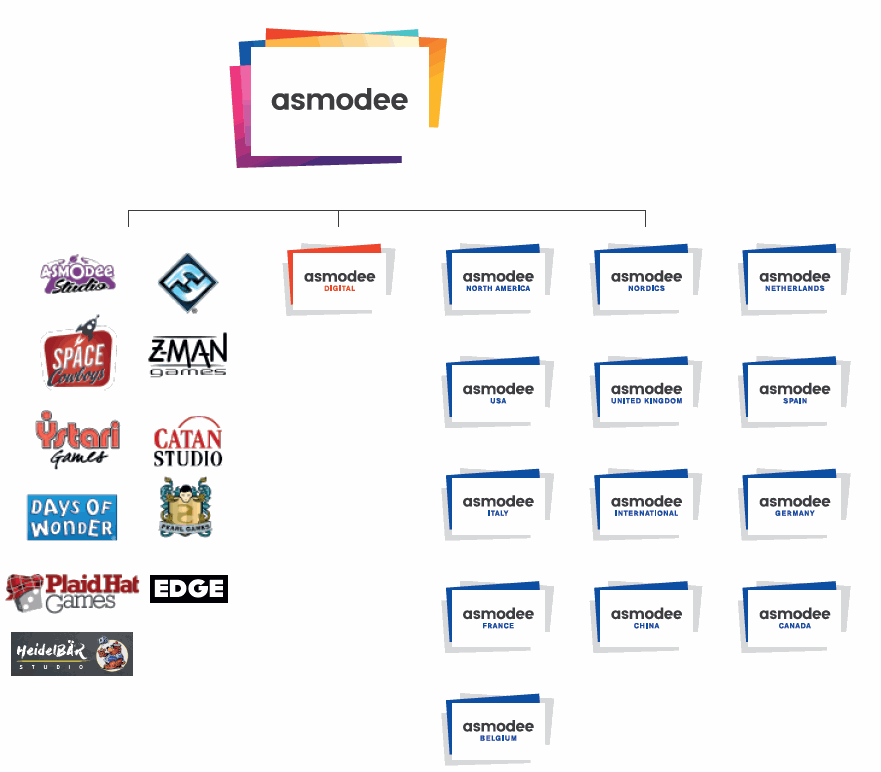 Asmodee精心制作了一个新的品牌口号:"Great Games,Amazing Stories." 创作者Havas Paris说:“这将赋予Asmodee全新的身份定位”。作为桌面游戏行业的世界领导者,我们创造和分享游戏,激励人们突破想象力的界限。Asmodee将在发展和扩大实体游戏及电子游戏产品类目的同时,围绕游戏IP进行跨平台发展。